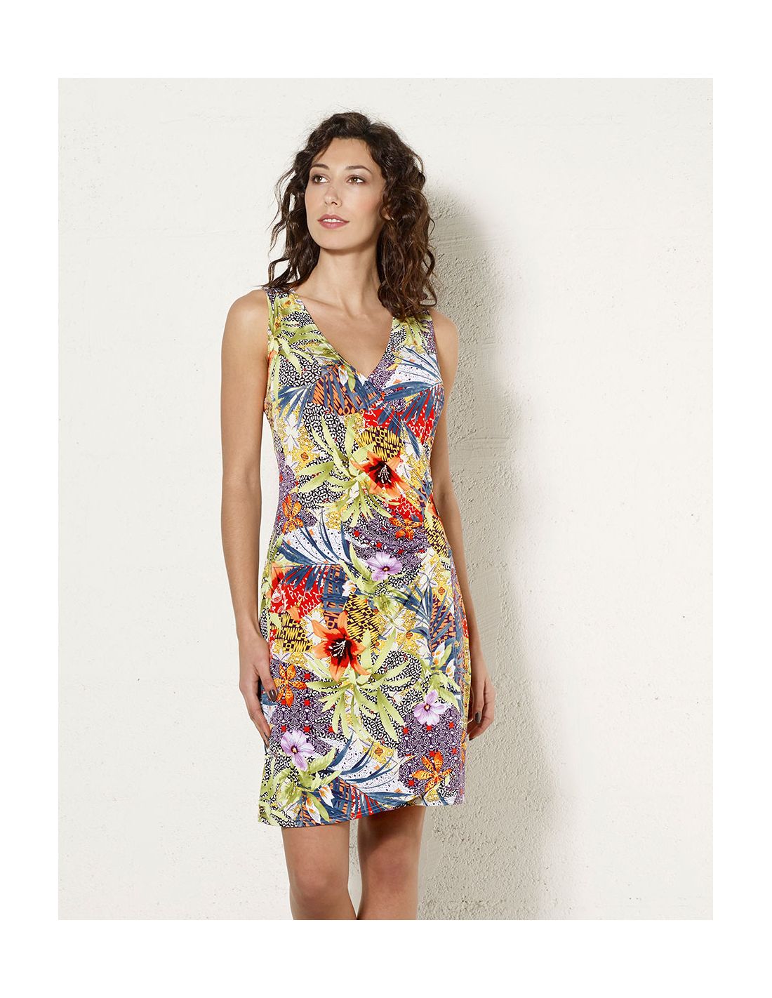Vestido malla 96% poliester4% elastano sin mangas estampado botanico