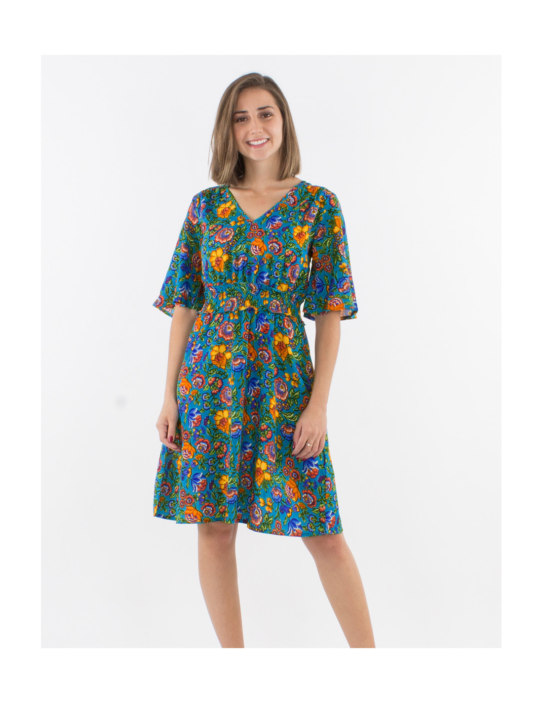 Vestido poliester mangas cortas estampado pivoine
